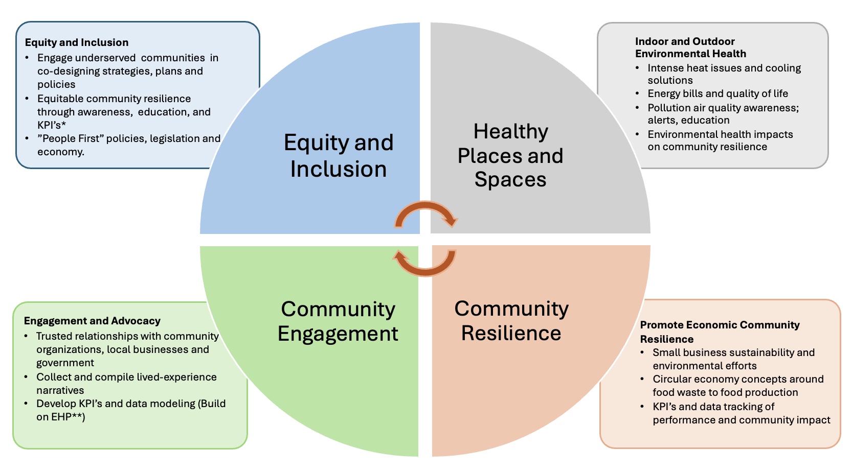 The diagram above shows issues shared by several local community-based organizations. Collected during listening sessions, these 4 categories represent what residents perceive as equitable quality of life issues or EQOL.